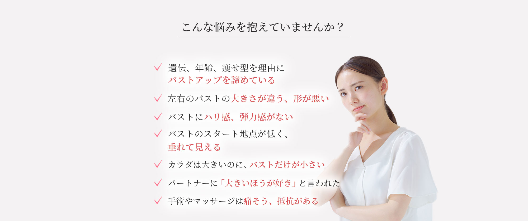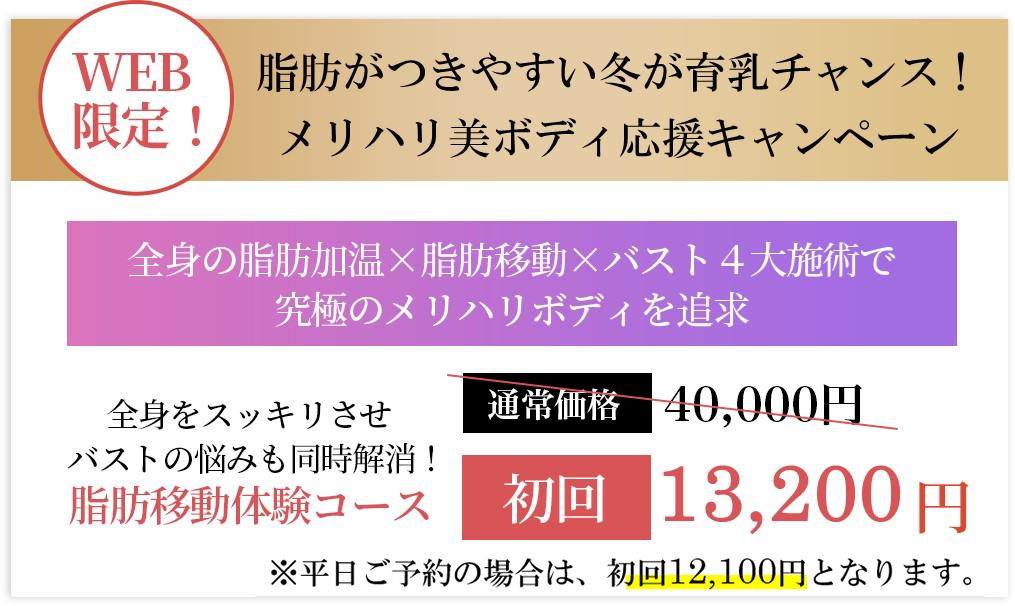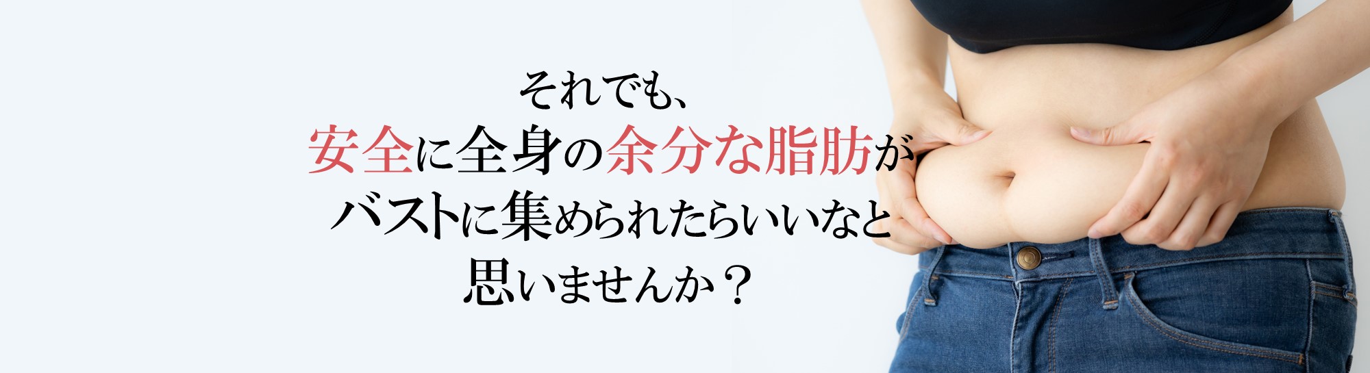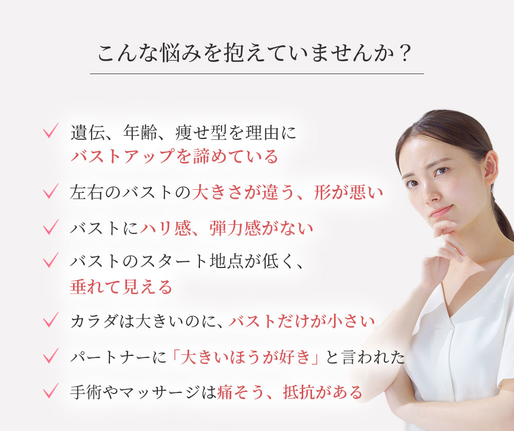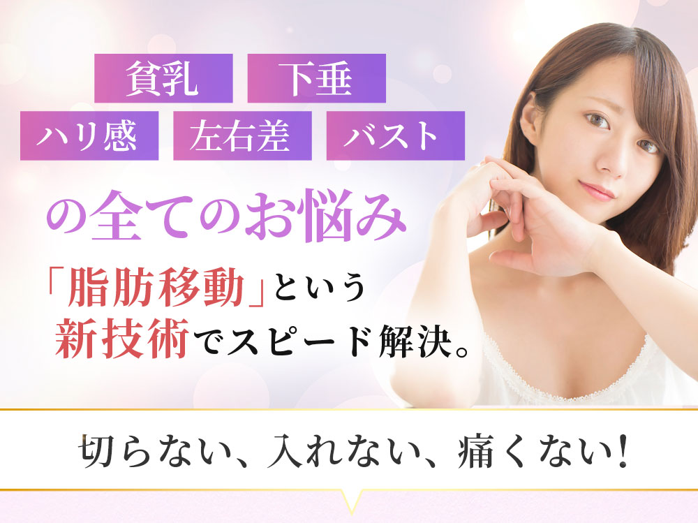 余分な脂肪をバストに変えるので、遺伝、年齢、体型は関係ありません。痩せ型の方でも余分な脂肪を移動させてバストアップできますし、ぽっちゃり型の方なら余分な脂肪がなくなり、くびれ、ヒップアップ効果も期待できます。