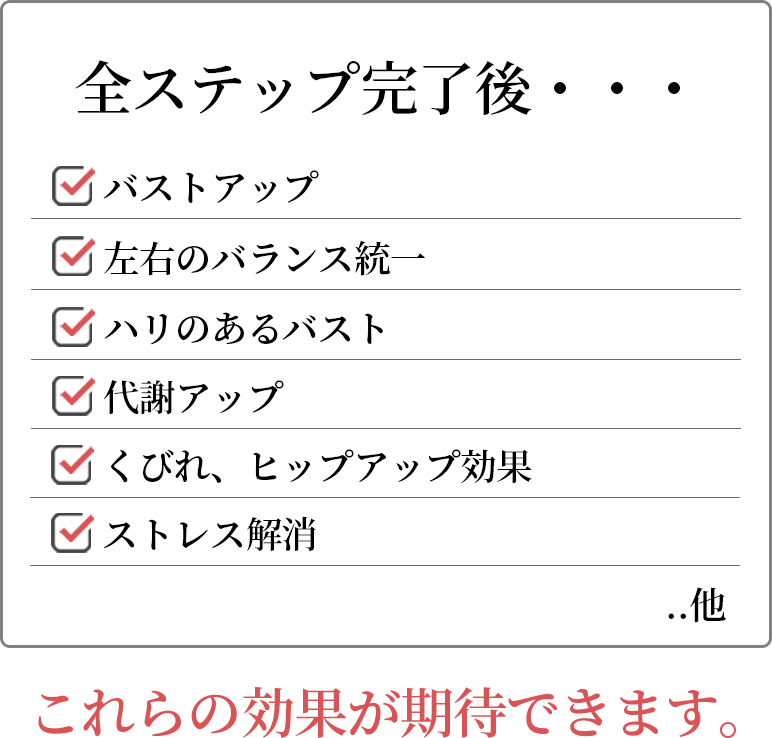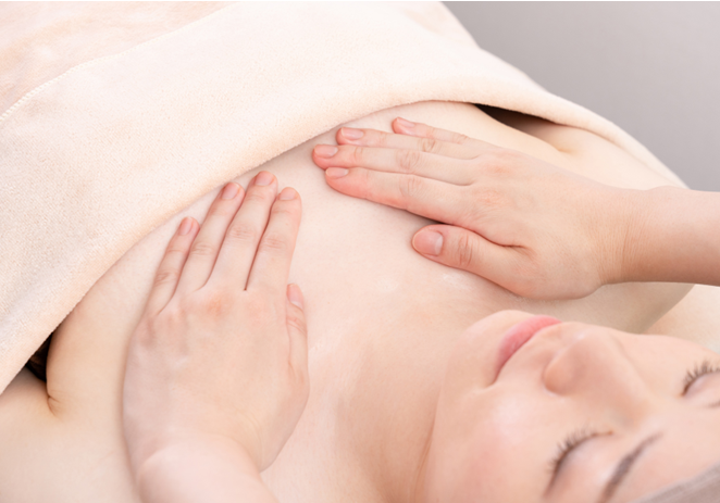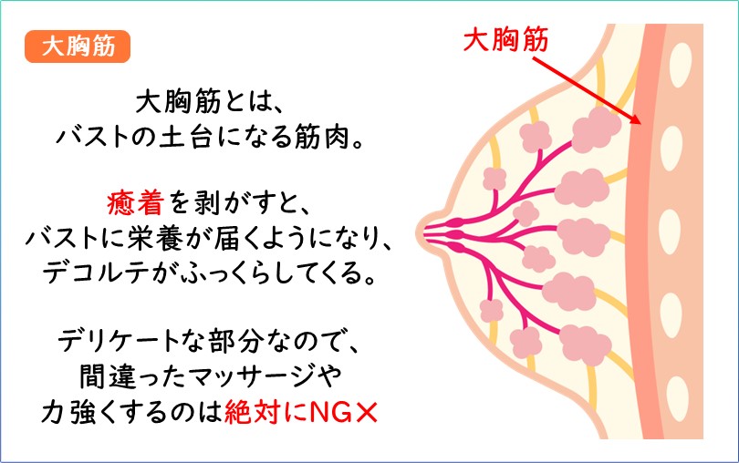 まず、大胸筋のこわばりをほぐし、老廃物の詰まりを改善させます。詰まりがなくなることで栄養が行き渡るようになり、デコルテがふっくらしてきます。